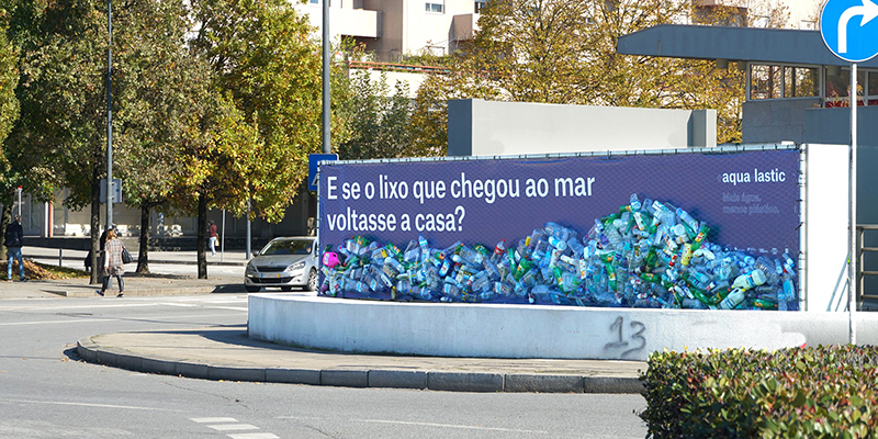 O grande cartaz, junto ao Hotel Ibis, contem a frase “E se o lixo que chegou ao mar voltasse a casa?” e “dentro” deste encontram-se cerca de duas centenas de garrafas de plástico.